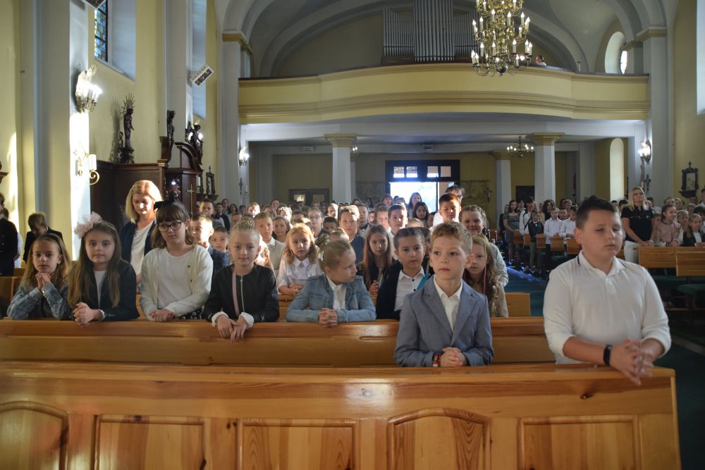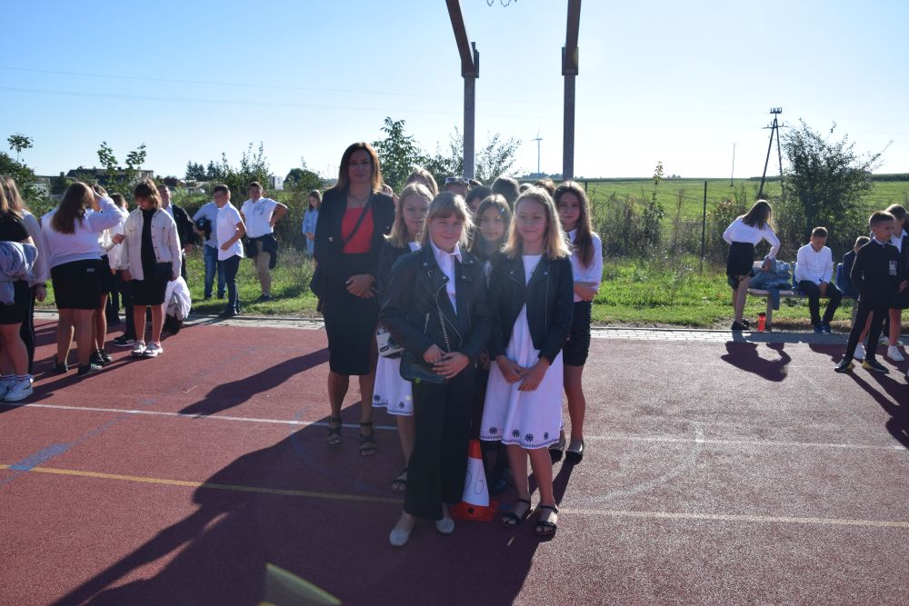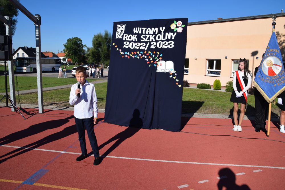 Nowy roku szkolny 2022/2023 rozpoczął się od mszy świętej w kościele parafialnym, której przewodniczył Ksiądz Proboszcz Wiesław Kondratowicz. Następnie społeczność szkolna przeszła na boisko, gdzie o godz. 9.00 Pani Dyrektor Elwira Łucka powitała wszystkich przybyłych uczniów, rodziców oraz grono pedagogiczne. Szczególne słowa skierowała do najmłodszych rozpoczynających naukę w naszej szkole. Rozpoczęcie roku szkolnego to także okazja do tego, by upamiętnić rocznicę wybuchu II wojny światowej. Pani Dyrektor w swoim wystąpieniu nawiązała do tego wydarzenia oraz apelowała o pokój dla Ojczyzny i świata w kontekście wojny na Ukrainie. Uroczystość inauguracyjną roku szkolnego uświetnił swoim śpiewem Oliwier Kowalczyk.