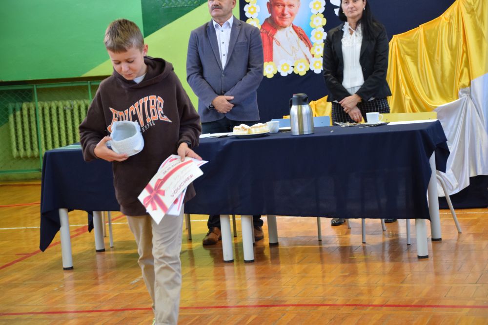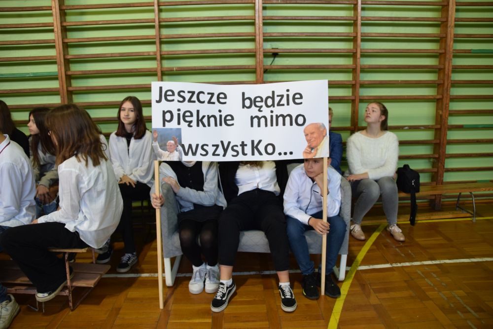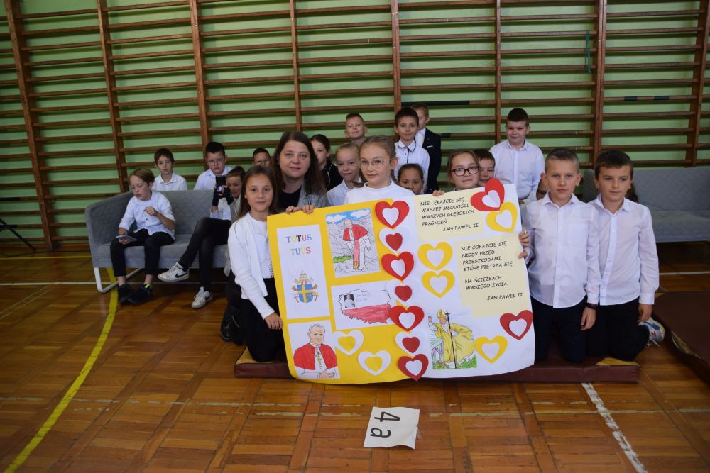 Klasy IV – VIII rywalizowały ze sobą w Turnieju Papieskim, w takich konkurencjach jak: okrzyk na cześć Jana Pawła II, prezentacja transparentów ze słowami Patrona, quiz wiedzy, podbijanie piłki i jedzenie kremówki papieskiej z zawiązanymi oczami.
