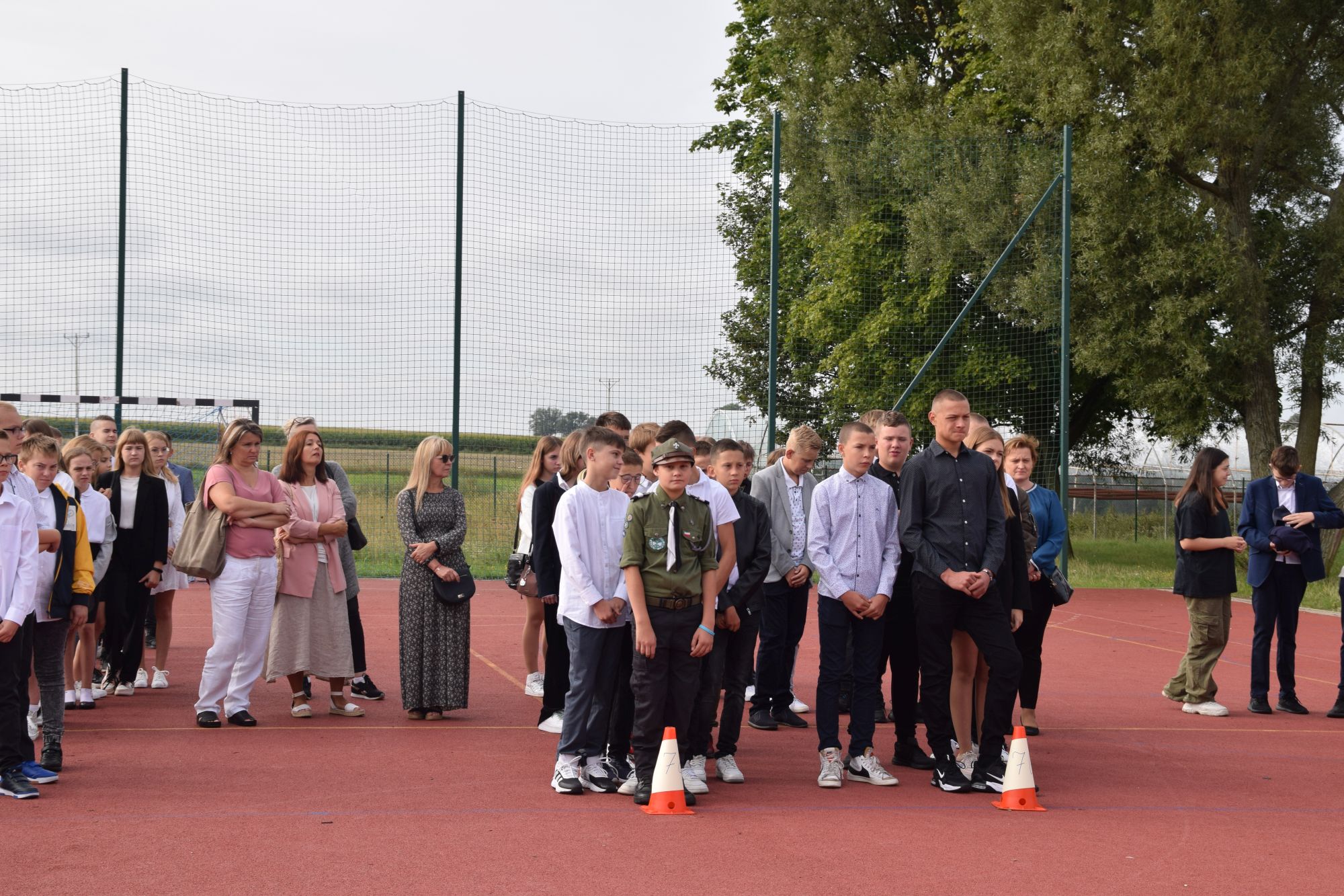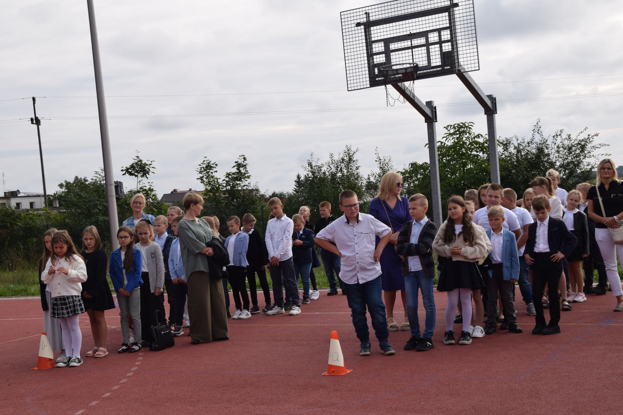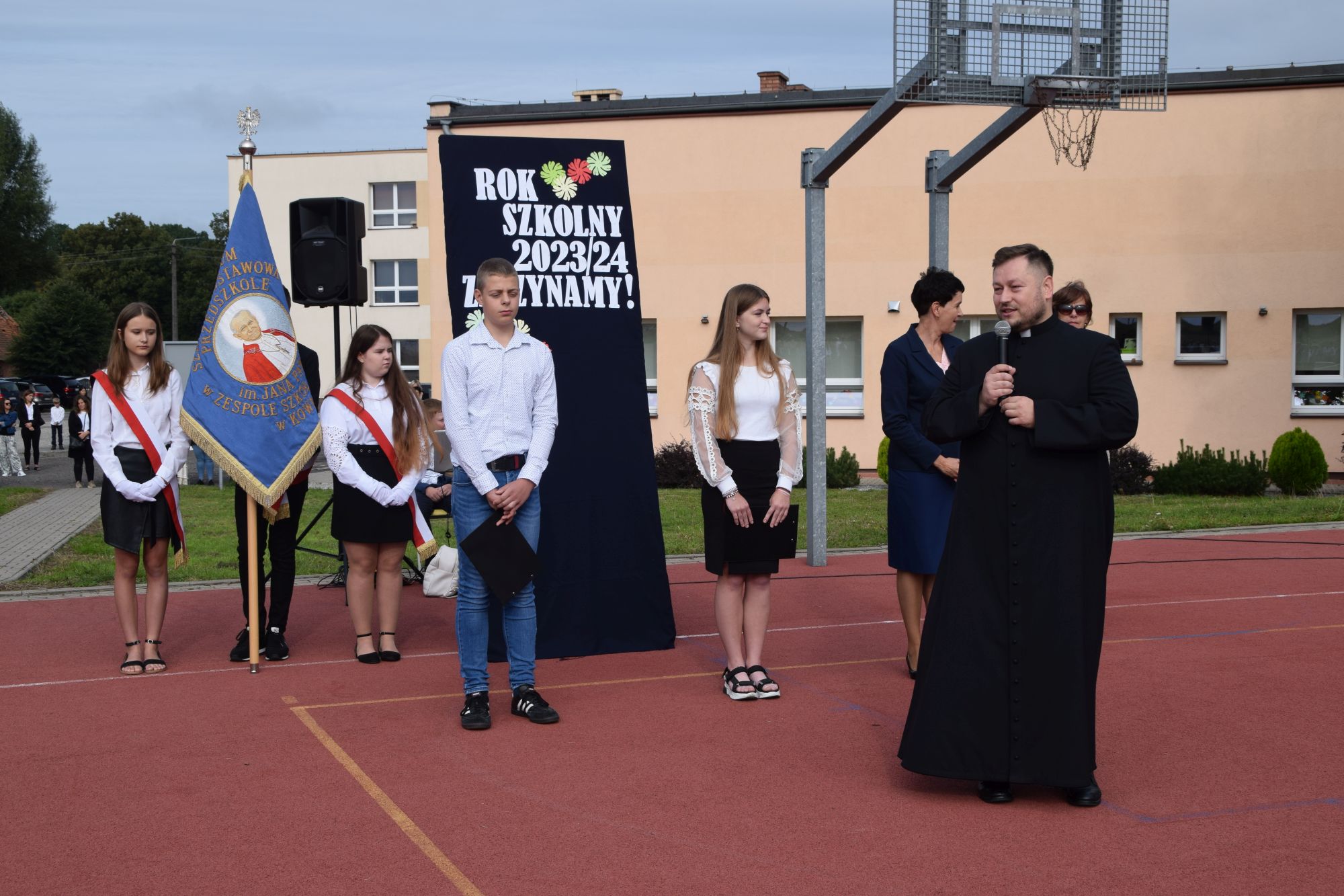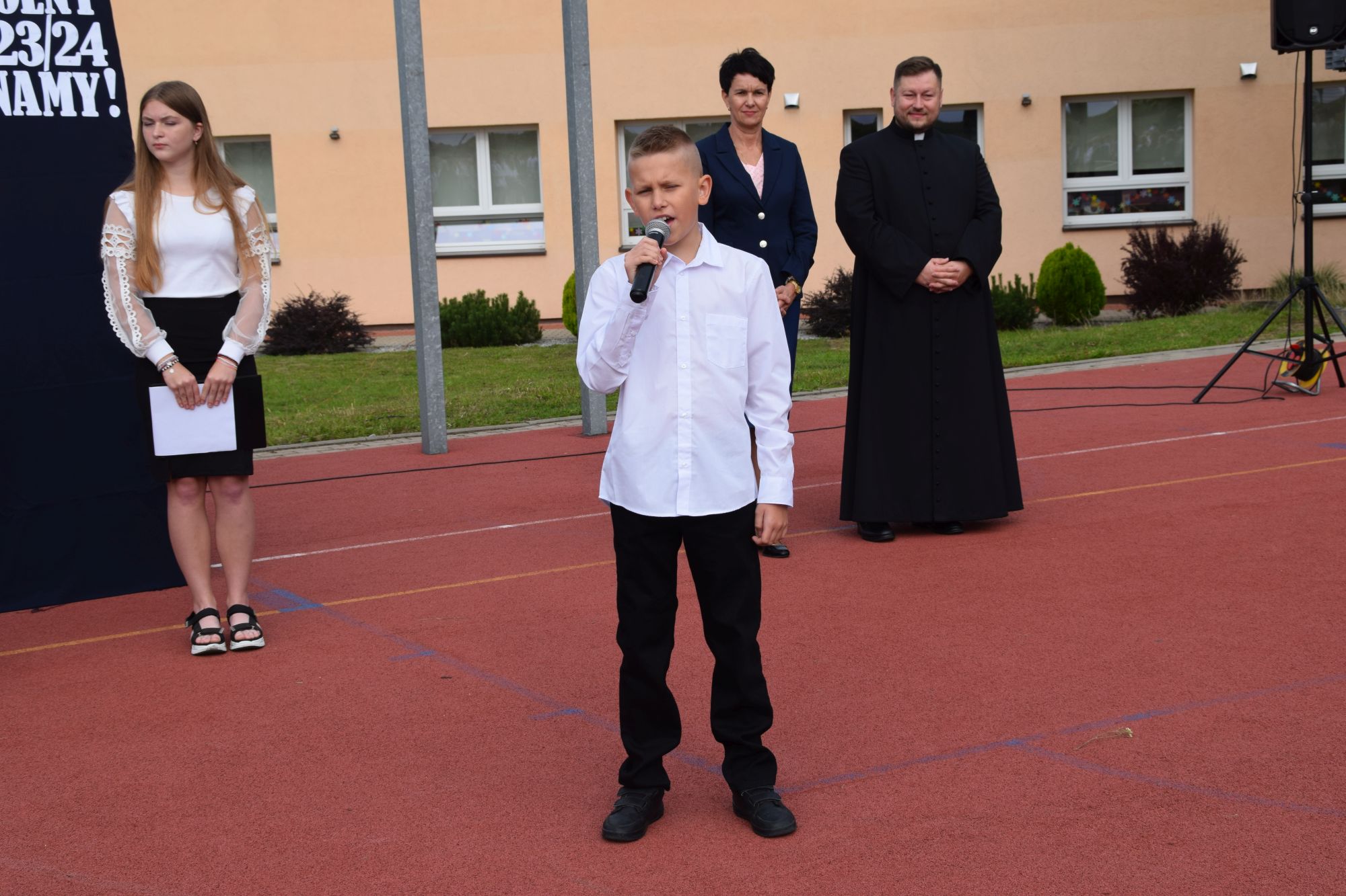 Nowy rok szkolny rozpoczął się 4 września 2023 roku uroczystą Mszą świętą, w której wzięli udział uczniowie, dyrekcja szkoły, nauczyciele oraz rodzice. Mszę świętą i kazanie wygłosił Ks. Proboszcz Krzysztof Raj. Po Eucharystii społeczność szkolna udała się na boisko, gdzie kontynuowano inaugurację nowego roku szkolnego. Wszystkich zebranych gorąco powitała Pani Dyrektor Elwira Łucka, która w szczególnie ciepłych słowach zwróciła się do nowych uczniów oraz do ósmoklasistów, dodając im otuchy i wiary w siebie, gdy będą podchodzić do egzaminów. Ksiądz Proboszcz, który dodatkowo ma wykształcenie psychologiczne, w swoim wystąpieniu przekazał dzieciom i młodzieży, by ze swoimi problemami zwracali się do pani psycholog zatrudnionej w naszej placówce lub do nauczycieli, wychowawców, rodziców. Uczniowie nie usłyszeli brzmienia pierwszego dzwonka, gdyż nauka będzie się odbywała bez dzwięków rozpoczynających i kończących zajęcia lekcyjne, co ma korzystnie wpłynąć na uczniów i nauczycieli. Uroczystość zakończyła się pięknym śpiewem wykonanym przez Oliwiera Kowalczyka z klasy 5a.