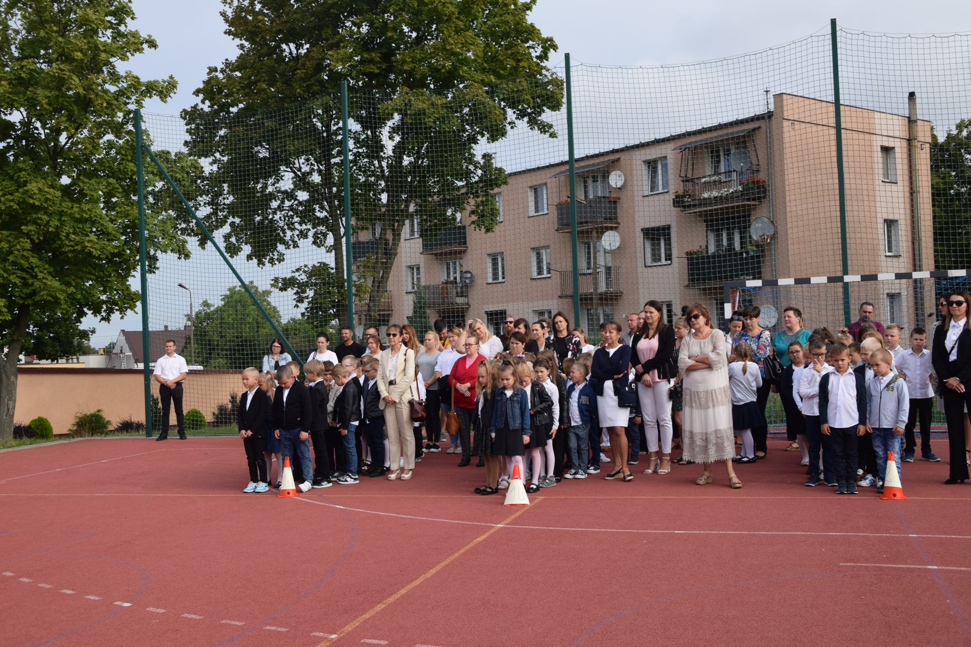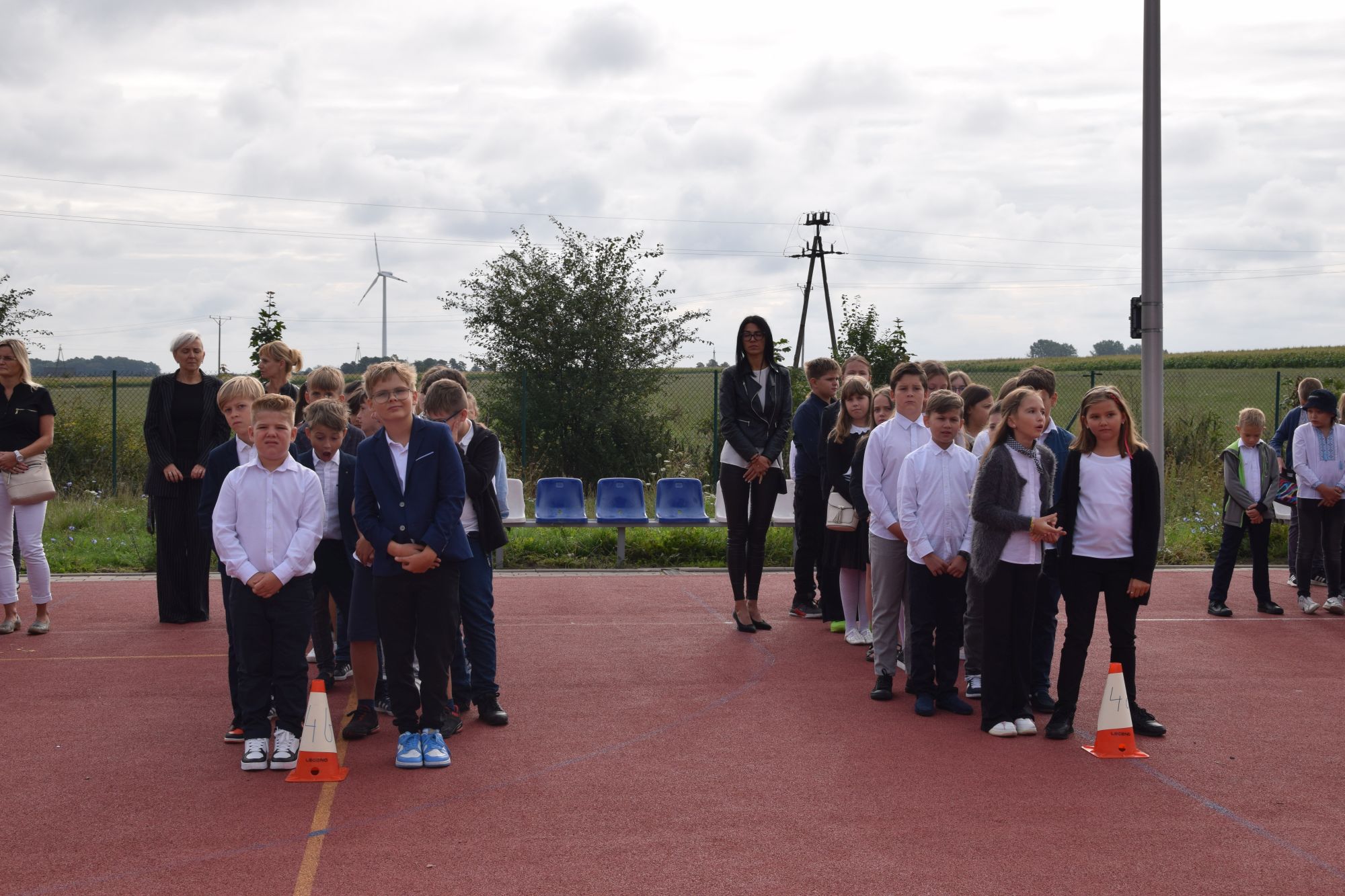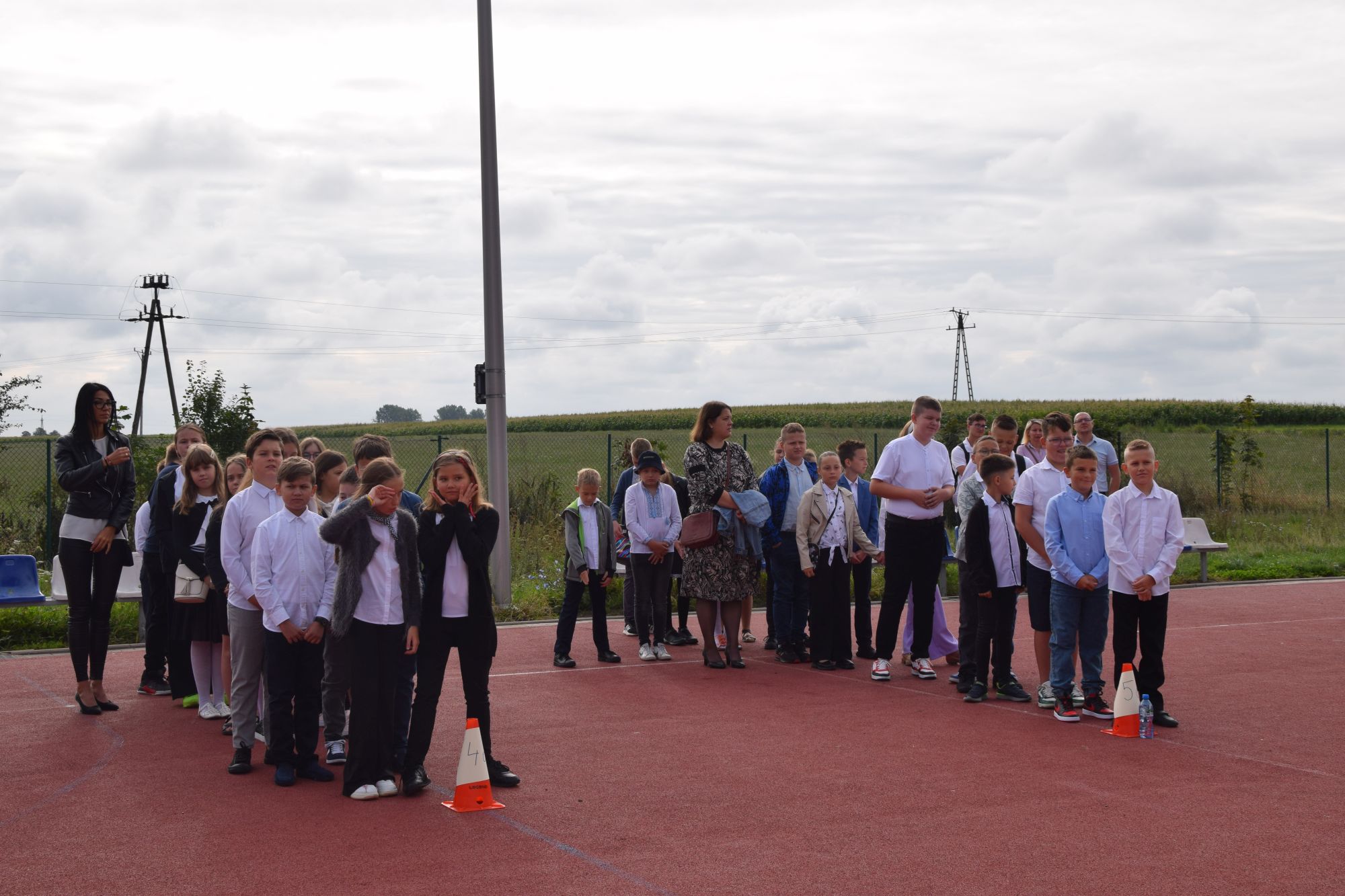 Nowy rok szkolny rozpoczął się 4 września 2023 roku uroczystą Mszą świętą, w której wzięli udział uczniowie, dyrekcja szkoły, nauczyciele oraz rodzice. Mszę świętą i kazanie wygłosił Ks. Proboszcz Krzysztof Raj. Po Eucharystii społeczność szkolna udała się na boisko, gdzie kontynuowano inaugurację nowego roku szkolnego. Wszystkich zebranych gorąco powitała Pani Dyrektor Elwira Łucka, która w szczególnie ciepłych słowach zwróciła się do nowych uczniów oraz do ósmoklasistów, dodając im otuchy i wiary w siebie, gdy będą podchodzić do egzaminów. Ksiądz Proboszcz, który dodatkowo ma wykształcenie psychologiczne, w swoim wystąpieniu przekazał dzieciom i młodzieży, by ze swoimi problemami zwracali się do pani psycholog zatrudnionej w naszej placówce lub do nauczycieli, wychowawców, rodziców. Uczniowie nie usłyszeli brzmienia pierwszego dzwonka, gdyż nauka będzie się odbywała bez dzwięków rozpoczynających i kończących zajęcia lekcyjne, co ma korzystnie wpłynąć na uczniów i nauczycieli. Uroczystość zakończyła się pięknym śpiewem wykonanym przez Oliwiera Kowalczyka z klasy 5a.