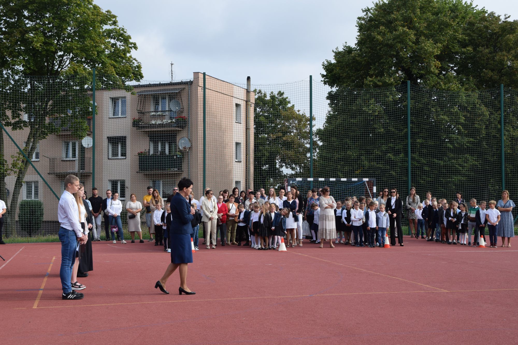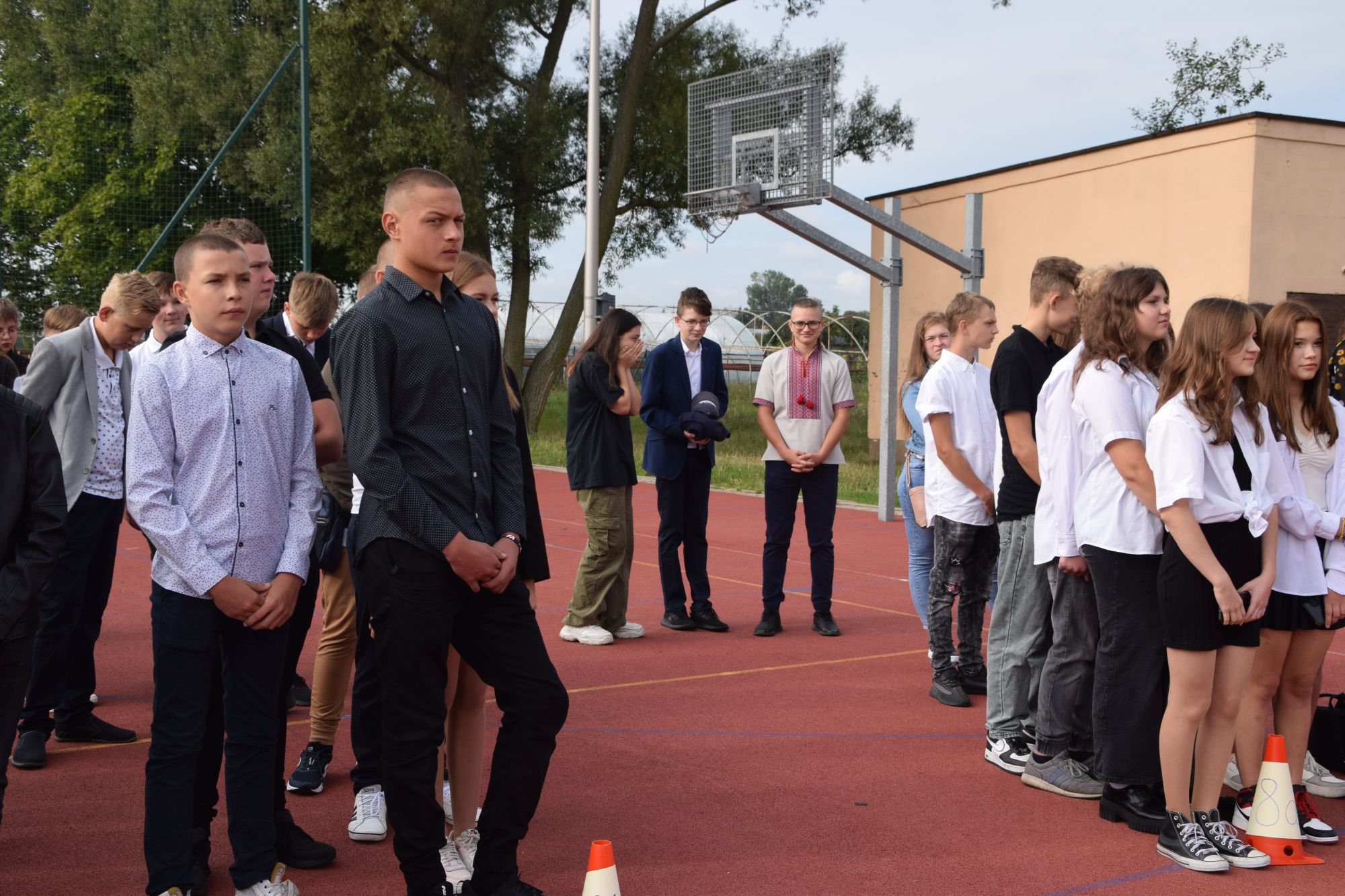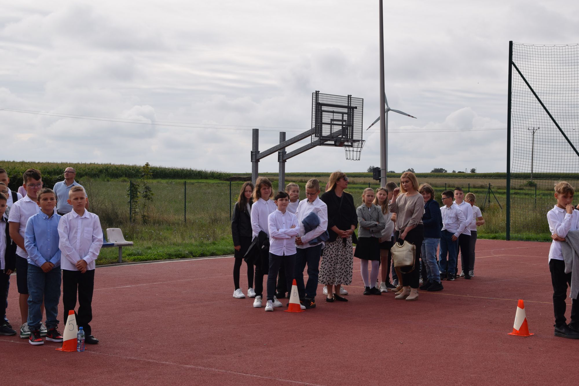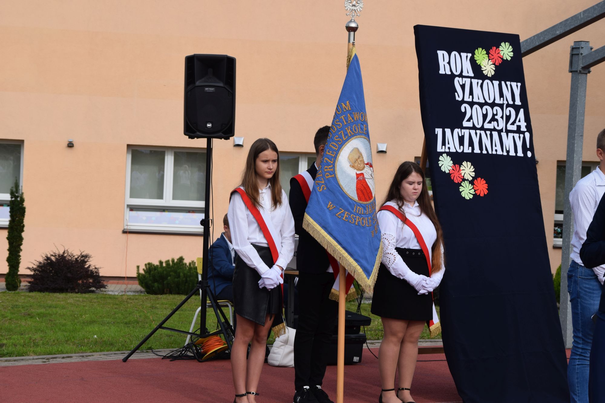 Nowy rok szkolny rozpoczął się 4 września 2023 roku uroczystą Mszą świętą, w której wzięli udział uczniowie, dyrekcja szkoły, nauczyciele oraz rodzice. Mszę świętą i kazanie wygłosił Ks. Proboszcz Krzysztof Raj. Po Eucharystii społeczność szkolna udała się na boisko, gdzie kontynuowano inaugurację nowego roku szkolnego. Wszystkich zebranych gorąco powitała Pani Dyrektor Elwira Łucka, która w szczególnie ciepłych słowach zwróciła się do nowych uczniów oraz do ósmoklasistów, dodając im otuchy i wiary w siebie, gdy będą podchodzić do egzaminów. Ksiądz Proboszcz, który dodatkowo ma wykształcenie psychologiczne, w swoim wystąpieniu przekazał dzieciom i młodzieży, by ze swoimi problemami zwracali się do pani psycholog zatrudnionej w naszej placówce lub do nauczycieli, wychowawców, rodziców. Uczniowie nie usłyszeli brzmienia pierwszego dzwonka, gdyż nauka będzie się odbywała bez dzwięków rozpoczynających i kończących zajęcia lekcyjne, co ma korzystnie wpłynąć na uczniów i nauczycieli. Uroczystość zakończyła się pięknym śpiewem wykonanym przez Oliwiera Kowalczyka z klasy 5a.