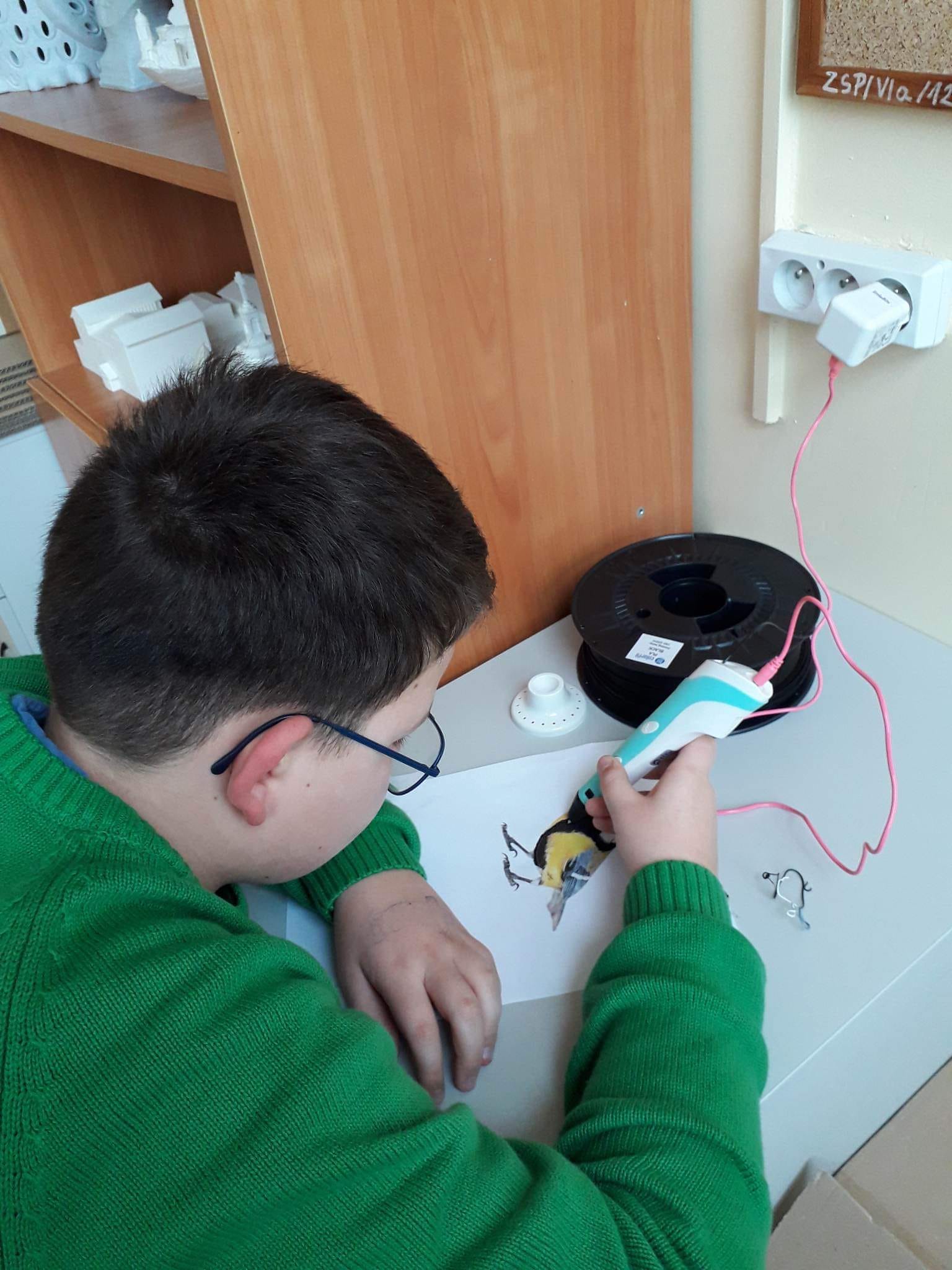 Uczniowie klasy IVa, Va oraz klasy Vb wspólnie przystąpili do projektu "Ptaki zimujące w Polsce" w ramach programu Laboratoria Przyszłości. Dzieci "drukowały" długopisami 3D najpopularniejsze ptaki przebywające zimą w Polsce. Następnie zrobiły wystawkę wydrukowanych ptaków na drzewku w holu oraz wykonały sztalugę z ptakami wydrukowanymi na drukarce atramentowej.