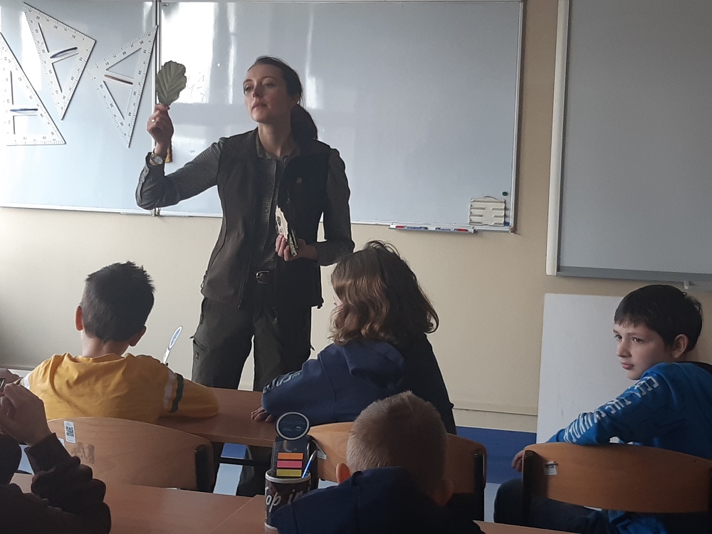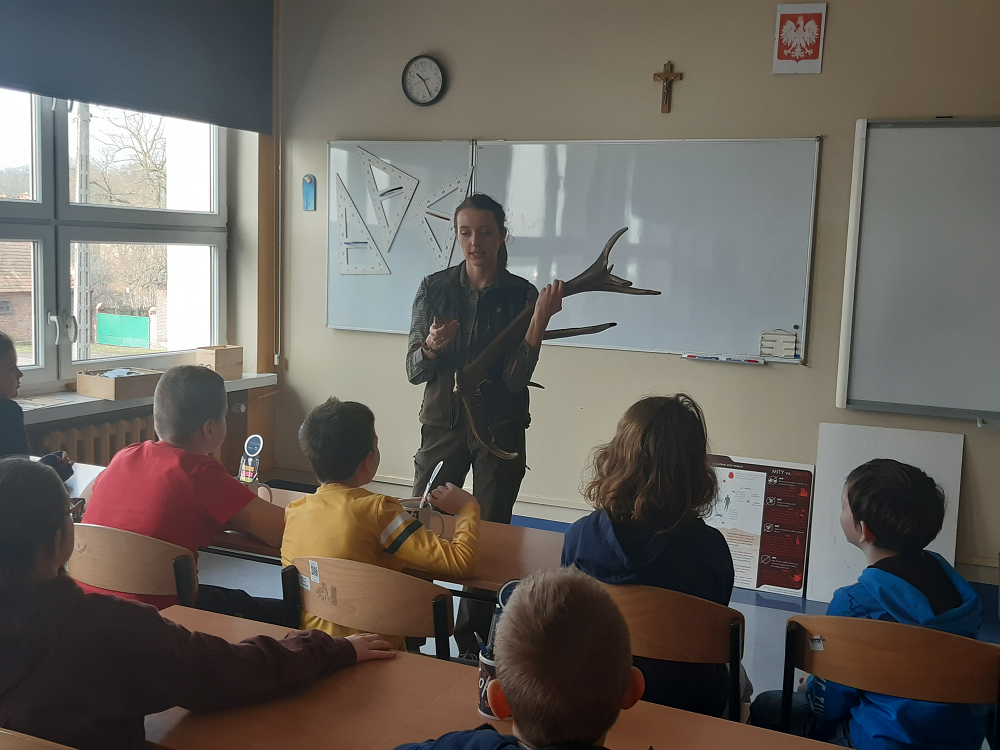 Pani Martyna przybliżyła uczniom tajniki pracy leśniczego oraz jak ważną funkcję dla nas i zwierząt pełni las. Uczniowie dowiedzieli się, jakiego rodzaju lasy występują w Polsce, jakie drzewa najczęściej w nich rosną oraz poznali gatunki zwierząt w nich żyjących.
