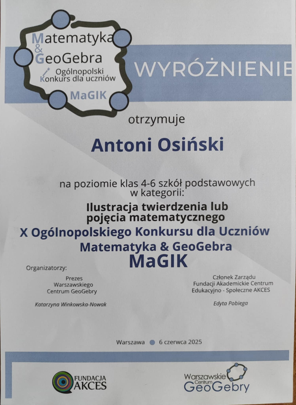 Antek Osiński otrzymał wyróżnienie w Ogólnopolskim Konkursie Matematyka & GeoGebra. Gratulujemy sukcesu i życzymy dalszych osiągnięć w rozwijaniu matematycznych pasji!