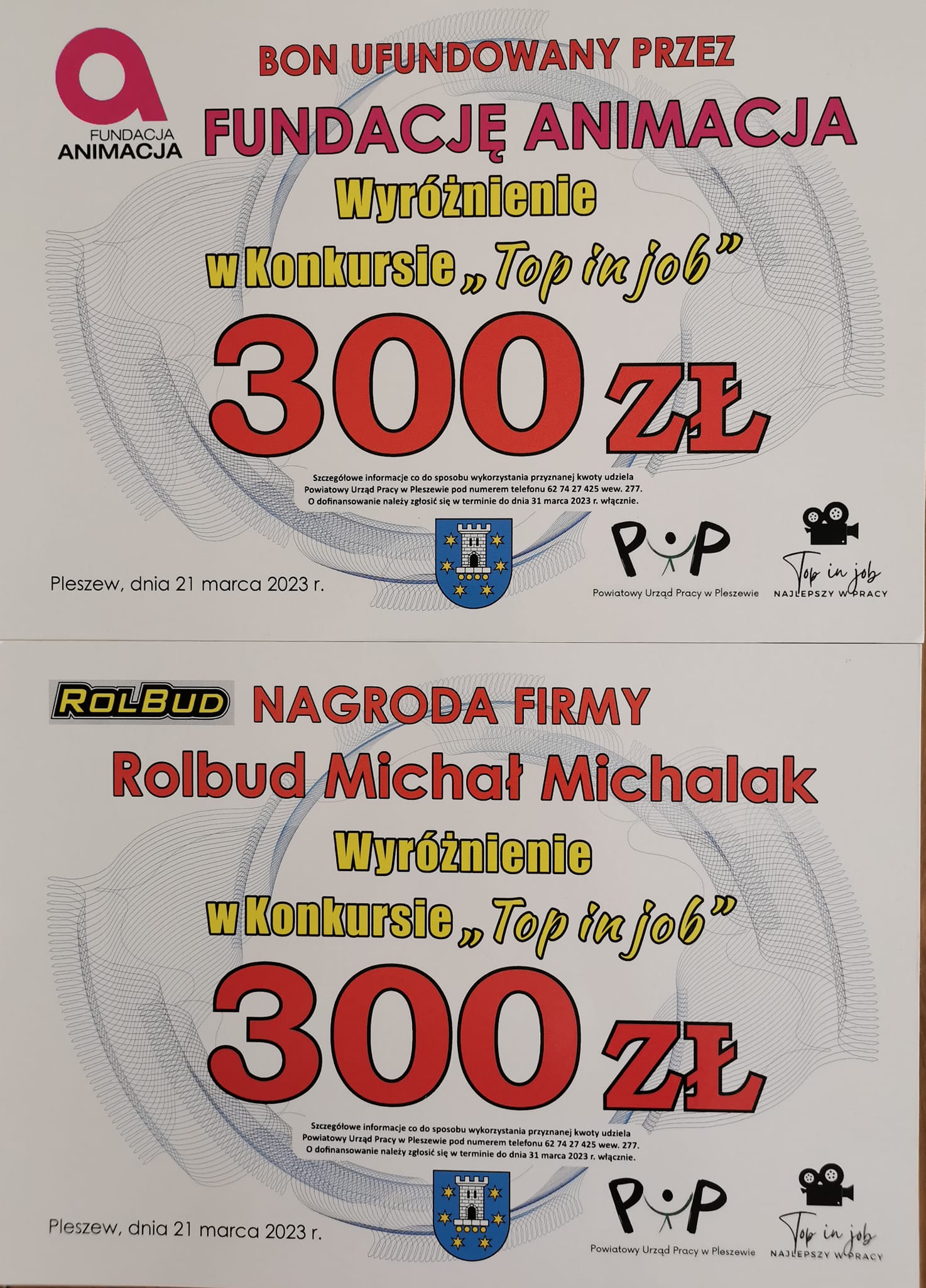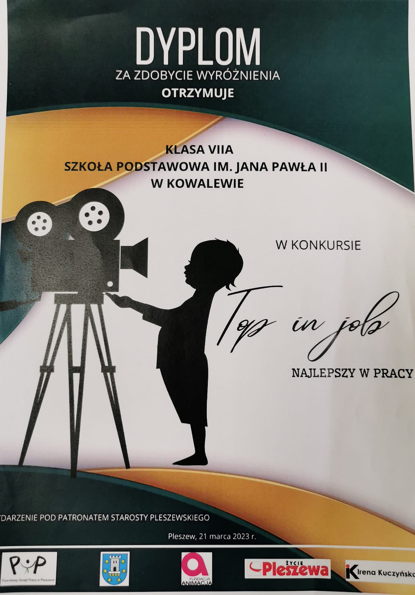 Nasza szkoła wzięła udział w konkursie "Top in job. Najlepszy w pracy" zorganizowanym przez Powiatowy Urząd Pracy w Pleszewie. Do konkursu przystąpiły 42 zespoły z różnych szkół powiatu pleszewskiego. Szkołę w Kowalewie reprezentowały klasy: 4a, 5a i 7a. Klasa 7a zdobyła wyróżnienie oraz 2 vouchery pieniężne po 300 zł.