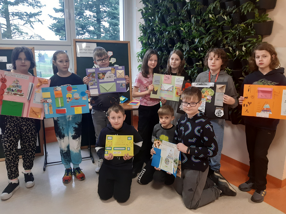 Uczniowie klas czwartych na lekcji przyrody poznali zasady zdrowego odżywiania. Następnie wykonali kolorowe Lapbooki, w których przygotowali różnego rodzaju krzyżówki, quizy czy puzzle dotyczące zdrowych nawyków żywienia. Nie zabrakło piramidy żywienia i aktywności fizycznej.