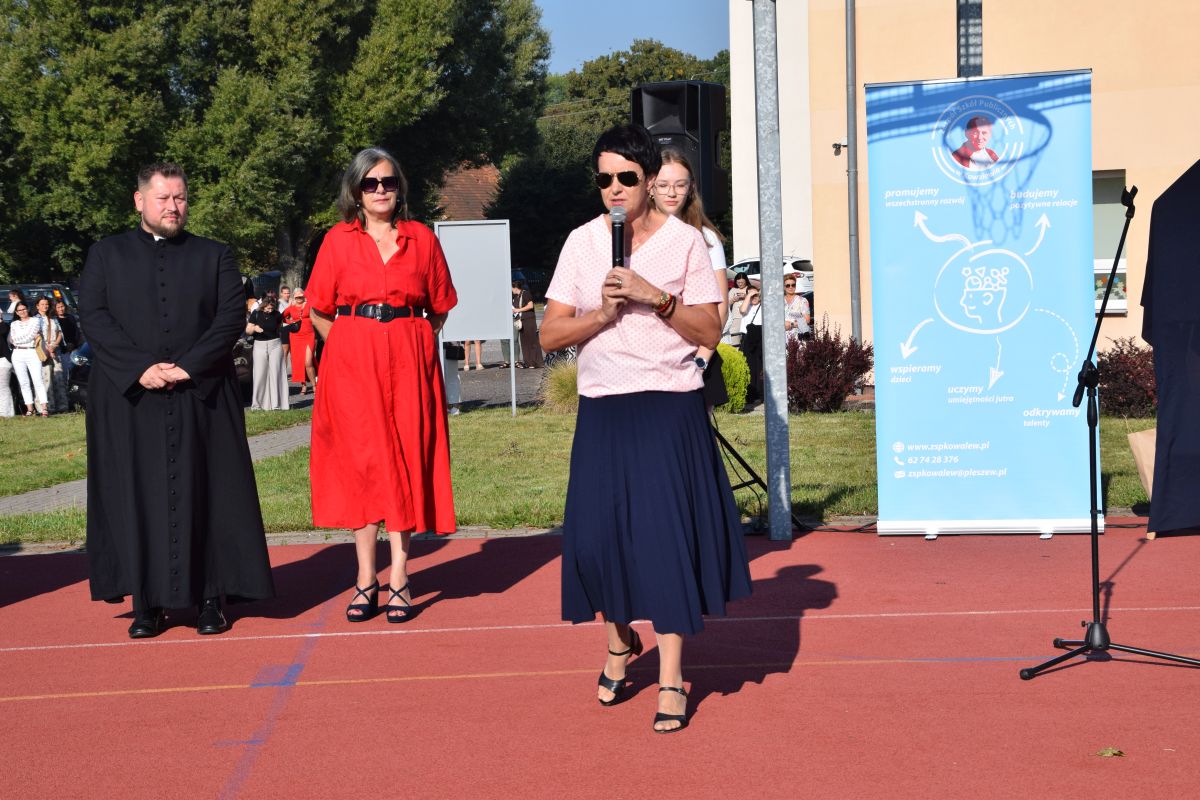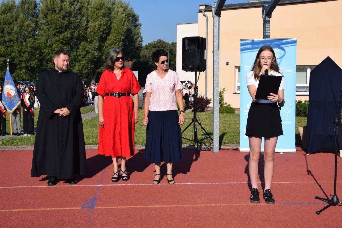 Po odśpiewaniu hymnu państwowego głos zabrała Pani Dyrektor Elwira Łucka. Powitała wszystkich zebranych, a w szczególnie serdecznych słowach zwróciła się do uczniów klas pierwszych, którzy rozpoczynają swoją szkolną przygodę. W swoim przemówieniu nawiązała również do 86. rocznicy wybuchu II wojny światowej, przypominając o znaczeniu pamięci historycznej i szacunku dla przeszłości.