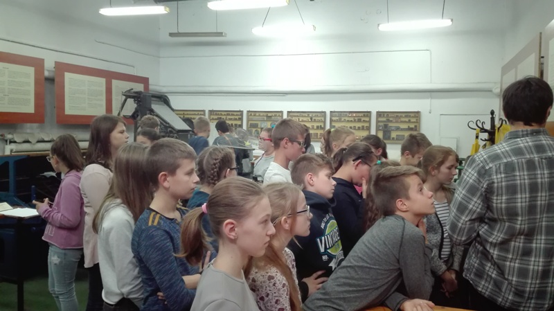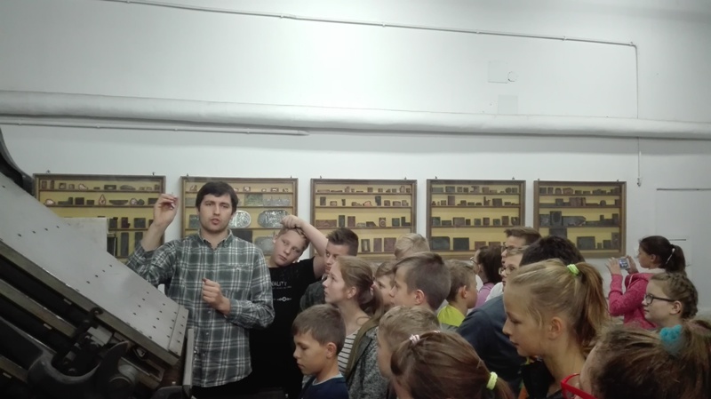Uczniowie pod kierunkiem przewodnika poznali historię i technikę powstawania książki. Zwiedzili dawną maszynownię fabryczną, maszyny do produkcji tkanin, maszyny parowe oraz silniki parowe, które wykorzystywane były do napędzania wszelkich urządzeń w dawnej fabryce. Następnie obejrzeli salę mieszczącą wyroby z porcelany.