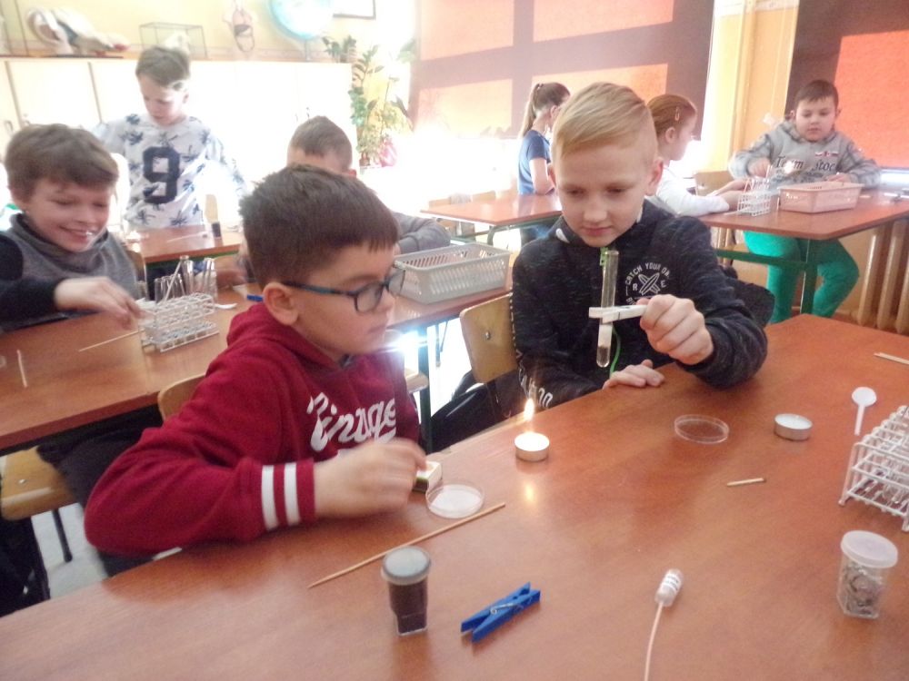 W pierwszej części zajęć uczniowie przystąpili do samodzielnego wykonywania ciekawych doświadczeń chemicznych. Tematem przewodnim zajęć były gazy ich otrzymywanie i identyfikacja.