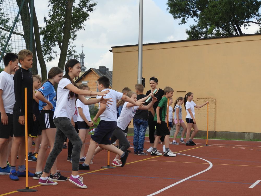 Turniej sportowy odbył się 15 maja 2018 roku na nowym boisku wielofunkcyjnym. W konkurencjach sportowych uczestniczyli uczniowie klas IV-V z wychowawcami oraz rodzicami. Otwarcia imprezy dokonała Pani wicedyrektor Aldona Jańczak. Konkurencje sportowe rozpoczęto rozgrzewką, którą przy muzyce prowadziły uczennice klas piątych: Milena Bochniak i Fatima Szymaniak. Zespoły klasowe brały udział w różnych zadaniach m.in.: "wyścigu zaprzęgów", "sadzeniu ziemniaków", "bieg z lodem", "przenoszeniu piłki", "sztafecie wahadłowej'. Drużyny dopingowały się w poszczególnych konkursach i zadaniach. Mimo różnic wiekowych wszyscy dobrze się bawili, co oznacza, że na aktywność ruchową nigdy nie jest za późno. Po zakończeniu zmagań sportowych uczestnicy zostali zaproszeni na skromny poczęstunek. W holu szkoły czekały kanapki i sałatki przygotowane przez uczniów klasy IIa gimnazjum. Zdrowe i kolorowe kanapki zachęcały do poczęstunku oraz uświadamiały, że sport i odpowiednie odżywianie to dwa nierozerwalne elementy warunkujące nasze zdrowie. Tam również można było obejrzeć plakaty wykonane przez uczniów klas IV-V na temat "Żyj zdrowo i na sportowo''. Po podliczeniu punktów za poszczególne konkurencje sportowe zostały wręczone dyplomy oraz nagrody: