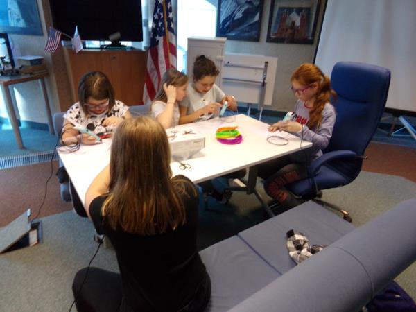 Ostatnim punktem wycieczki była wizyta w Amerykańskim Centrum Kultury - American Corner przy Uniwersytecie Łódzkim. Jest to biblioteka, która organizuje spotkania i wywiady z ciekawymi ludźmi poruszające różną tematykę ale zawsze związaną ze Stanami Zjednoczonymi. Uczestnicy wzięli udział w pogadance na temat USA a następnie uczestniczyli w krótkich warsztatach, gdzie testowali roboty Wonder Dash, tworzyli własne kompozycje plastyczne z użyciem trójwymiarowych długopisów oraz komponowali z elementów układanki obwody elektryczne.