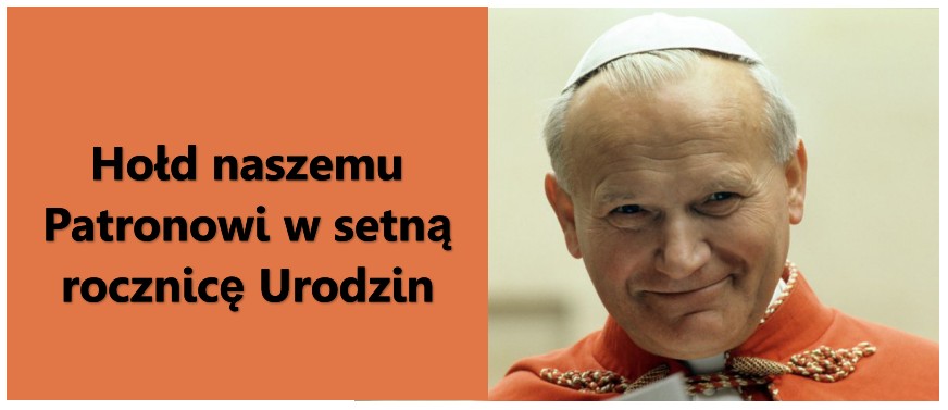 Nasza szkoła jest dumna, że nosi imię Jana Pawła II. Mimo pandemii, cała społeczność szkolna włączyła się do uczczenia setnej rocznicy Urodzin naszego Patrona. Uczniowie w ramach wielu zajęć zdalnych przygotowali różnego rodzaju prace, aby oddać hołd Papieżowi Polakowi. Przygotowali laurki, plakaty, sketchnotki i inne. W ramach zajęć z SCI powstały popiersia naszego Patrona oraz latarenka z wizerunkiem Jana Pawła II. Wszystkie działania naszych uczniów zostały zebrane na stronie przygotowanej z okazji 100. rocznicy urodzin Jana Pawła II.