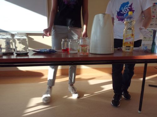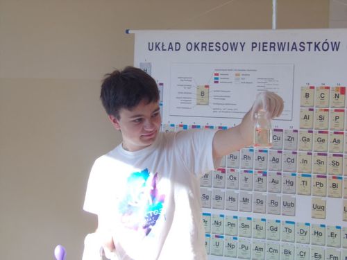 Ola i Adam zaprezentowali tego dnia kilka ciekawych doświadczeń, np. zegar jodowy, badanie napięcia powierzchniowego wody, otrzymywanie i badanie właściwości dwutlenku węgla oraz doświadczenie ile może pomieścić pieluszka czyli badanie właściwości absorpcyjnych poliakrylanu sodu.
