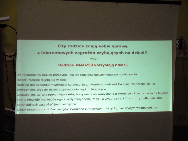 Przybliżyła Rodzicom nie tylko zagrożenia czyhające na dzieci i młodzież w sieci, ale także udzieliła wskazówek w jaki sposób kontrolować funkcjonowanie swoich dzieci w Internecie. Temat jest bardzo szeroki i z pewnością będziemy do niego wielokrotnie wracać. Zapraszamy do zapoznania się z prezentacją wykorzystaną podczas spotkania.