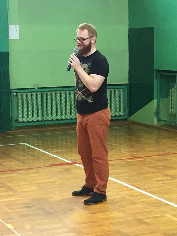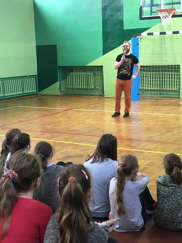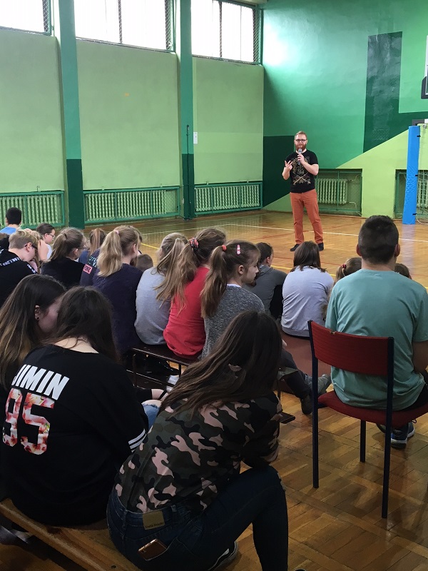 Jako aktywny gracz postanowił rozmawiać z młodzieżą na temat uzależnienia od gier komputerowych, niebezpieczeństwach za tym idących, ale i o rozsądnym korzystaniu z mediów. W spotkaniu wzięli udział uczniowie klas 4-7 i gimnazjum.