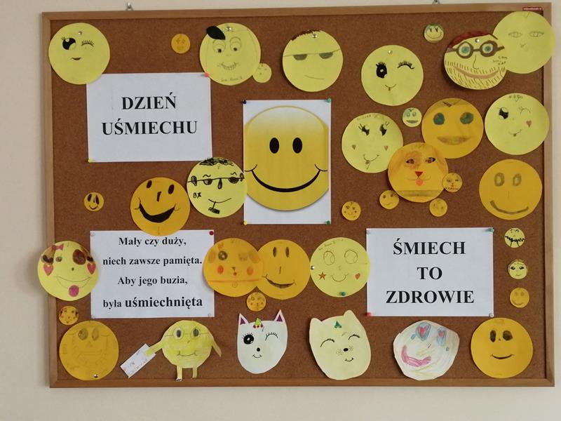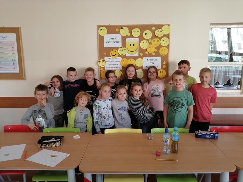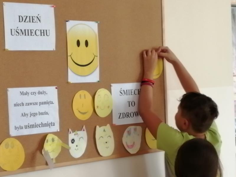 4 października 2019 r. w świetlicy szkolnej urządzono konkurs rysunkowy poświęcony Międzynarodowemu Dniu Uśmiechu. Uczniowie otrzymali z rąk nauczycieli, Katarzyny Ziemkiewicz i Pawła Jakubowskiego, wycięte małe i duże buźki, a ich zadaniem było przedstawienie najpiękniejszego uśmiechu. Zabawa była przednia. Efekty pracy wywieszono na koniec na gazetce w świetlicy.