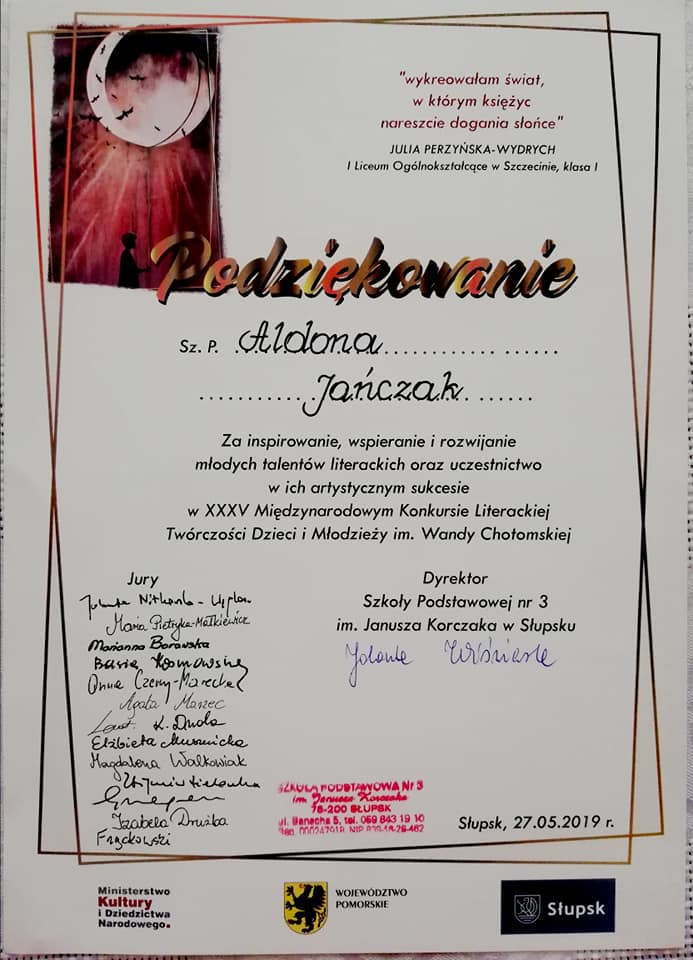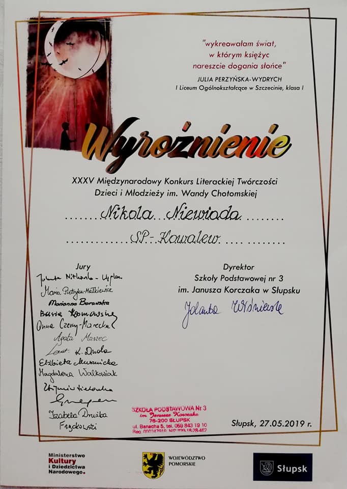 W jednym z nich została wyróżniona. Mowa o XXXV Międzynarodowym Konkursie Literackiej Twórczości Dzieci i Młodzieży im. Wandy Chotomskiej. Jest to sukces niemały, gdyż na konkurs nadesłano 8695 prac ze szkół z całej Polski, Stanów Zjednoczonych, Niemiec, Litwy i Ukrainy. Jury składające się m.in. z literaturoznawców, historyków literatury, poetów, pisarzy i polonistów wyłoniło 162 Laureatów i wyróżniło 272 uczniów.