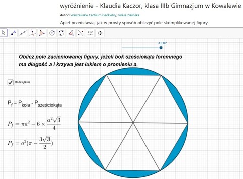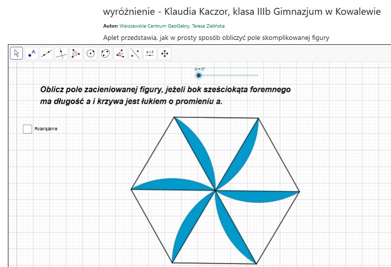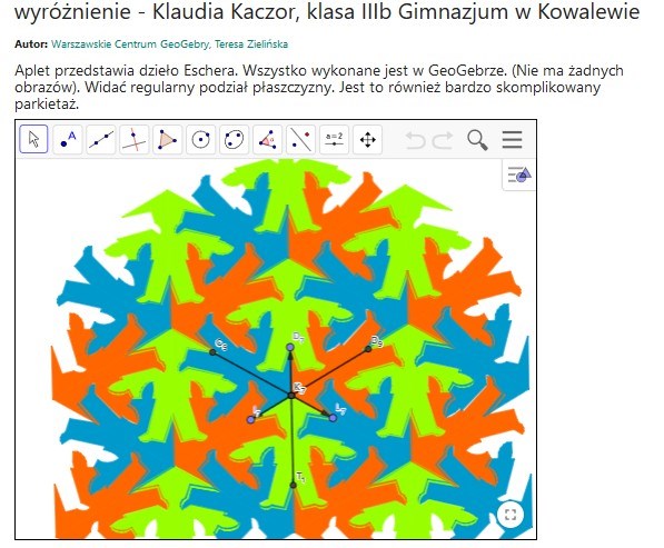 Klaudia Kaczor otrzymała dwa wyróżnienia w IV edycji Ogólnopolskiego Konkursu Matematyka & GeoGebra MaGIK w kategorii Ilustracja twierdzenia lub pojęcia matematycznego oraz w kategorii Ilustracja elementów sztuki lub techniki z GeoGebrą.