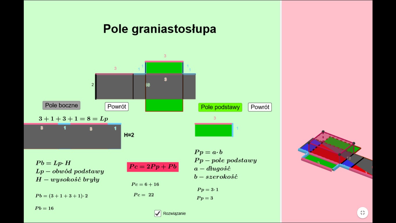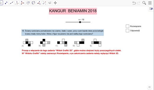 Kinga zwizualizowała obliczanie pól graniastosłupów, a Asia zwizualizowała 30 zadań z Kangura z 2018 roku. Laureatki wykorzystały różne narzędzia i przekształcenia matematyczne, by uzasadnienie i wyjaśnienie problemu było dynamiczne.