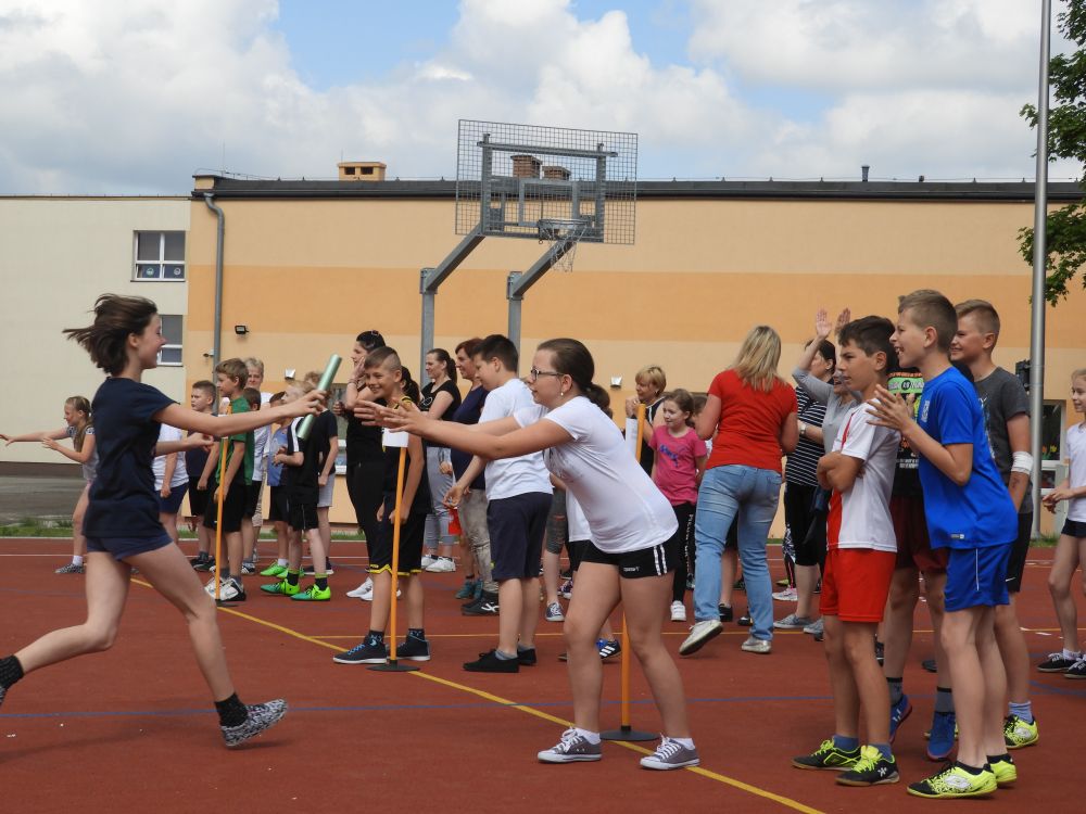 Turniej sportowy odbył się 15 maja 2018 roku na nowym boisku wielofunkcyjnym. W konkurencjach sportowych uczestniczyli uczniowie klas IV-V z wychowawcami oraz rodzicami. Otwarcia imprezy dokonała Pani wicedyrektor Aldona Jańczak. Konkurencje sportowe rozpoczęto rozgrzewką, którą przy muzyce prowadziły uczennice klas piątych: Milena Bochniak i Fatima Szymaniak. Zespoły klasowe brały udział w różnych zadaniach m.in.: "wyścigu zaprzęgów", "sadzeniu ziemniaków", "bieg z lodem", "przenoszeniu piłki", "sztafecie wahadłowej'. Drużyny dopingowały się w poszczególnych konkursach i zadaniach. Mimo różnic wiekowych wszyscy dobrze się bawili, co oznacza, że na aktywność ruchową nigdy nie jest za późno. Po zakończeniu zmagań sportowych uczestnicy zostali zaproszeni na skromny poczęstunek. W holu szkoły czekały kanapki i sałatki przygotowane przez uczniów klasy IIa gimnazjum. Zdrowe i kolorowe kanapki zachęcały do poczęstunku oraz uświadamiały, że sport i odpowiednie odżywianie to dwa nierozerwalne elementy warunkujące nasze zdrowie. Tam również można było obejrzeć plakaty wykonane przez uczniów klas IV-V na temat "Żyj zdrowo i na sportowo''. Po podliczeniu punktów za poszczególne konkurencje sportowe zostały wręczone dyplomy oraz nagrody: