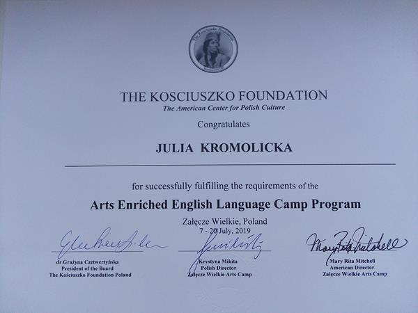 Koszty pobytu w kwocie 2500,00 pokryła Fundacja Kościuszkowska - amerykańsko-polska instytucja kulturalno-oświatowa współpracująca z programem English Teaching. W ciągu 14 dni pobytu Julia uczestniczyła w warsztatach językowych z native speakerami a także zajęciach prowadzonych przez wykładowców Akademii Sztuk Pięknych w Łodzi. Gratulujemy Julii zdobycia nowych umiejętności i zachęcamy Was do aktywnej nauki języka angielskiego. Relacja pobytu http://www.englishteaching.org.pl/pl/aktualnosci/584-lato-z-english-teaching-obozy-jezykowe-w-zaleczu
