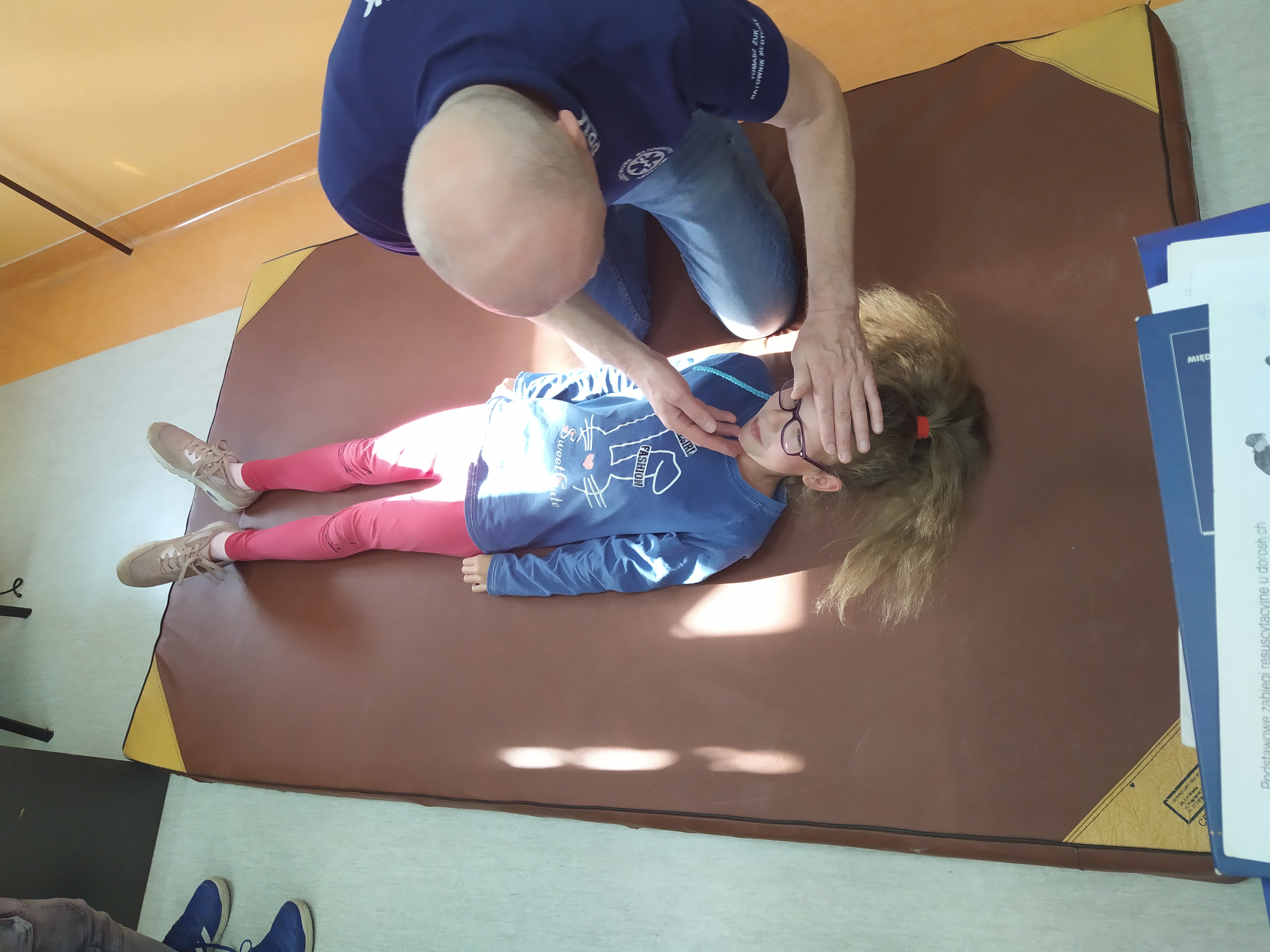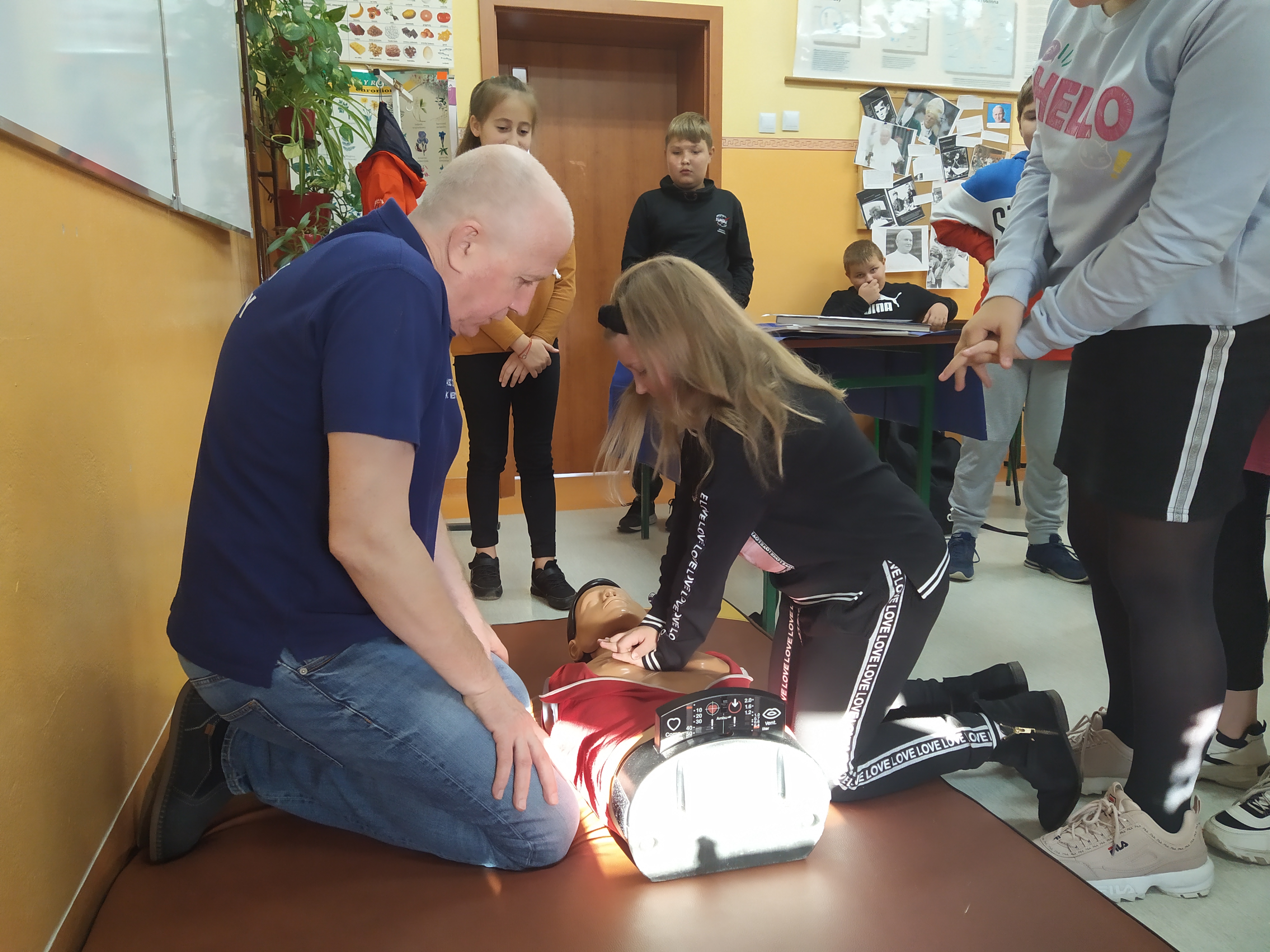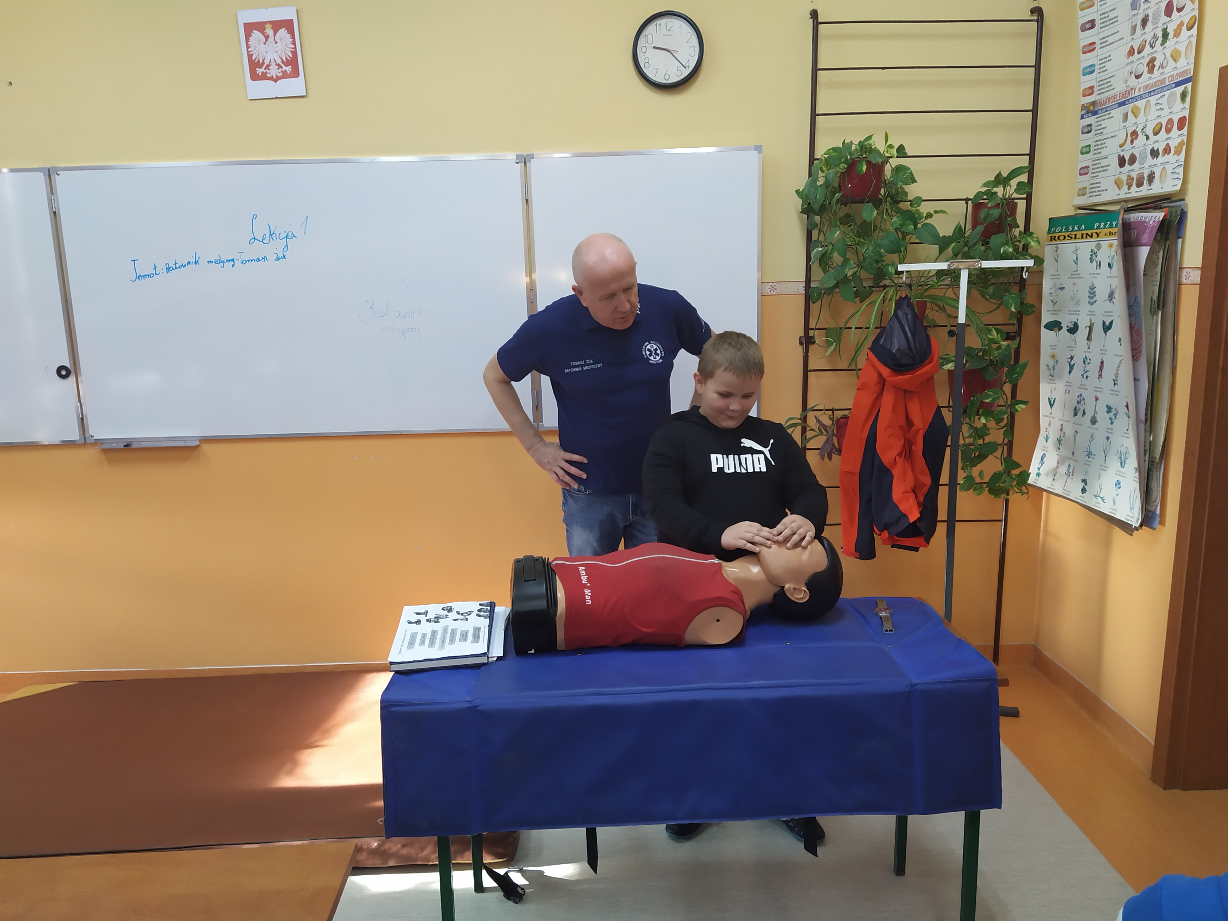 Na wstępie uczniowie omówili, czym jest pierwsza pomoc, poznali procedurę wzywania służb ratunkowych i rzetelnego przekazywania informacji dotyczących nieszczęśliwego zdarzenia. Następnie każdy uczeń ćwiczył kontrolowanie czynności życiowych, układanie poszkodowanego w pozycji bocznej ustalonej oraz resuscytację krążeniowo – oddechową z użyciem fantomu.