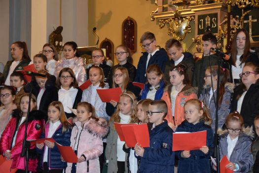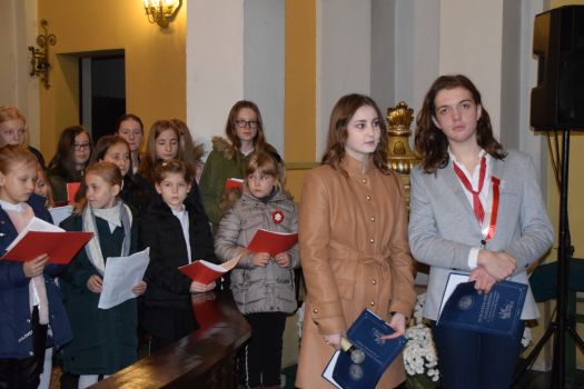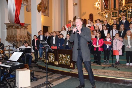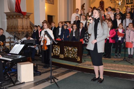 Młodzież i dzieci wystąpiły w repertuarze pieśni patriotycznych i religijnych pod dyrekcją Pana Łukasza Adamskiego - nauczyciela muzyki. Śpiew - Adrianna Klötzel, Piotr Sikora, skrzypce - Hanna Adamska, trąbka - Kamil Kasołka, gitara akustyczna - Bartosz Osicki, gitara basowa - Daniel Cieślak, piano - Łukasz Adamski, perkusja - Adam Waszak. W muzycznym wydarzeniu wzięli także udział absolwenci szkoły w Kowalewie: Kornelia Szymaniak i Gwidon Waliszewski. Koncert prowadzili: Gabriela Stępień i Wiktor Łuczak - absolwenci szkoły w Taczanowie.