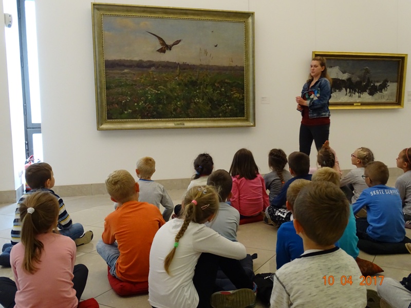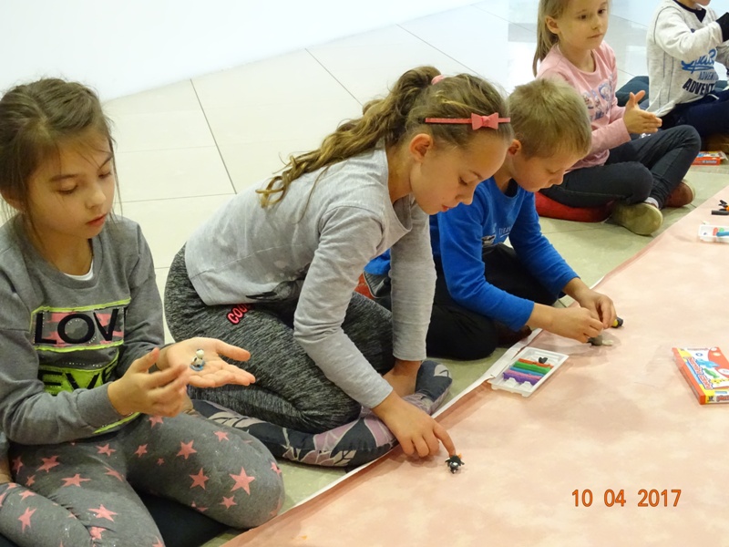 Dzieci uczestniczyły w lekcji „Muzealny zwierzyniec”. Spacerowały po galerii poznając jej wnętrze, wyszukiwały zwierzęta ukryte na obrazach. W części warsztatowej lepiły figurki zwierząt z plasteliny.