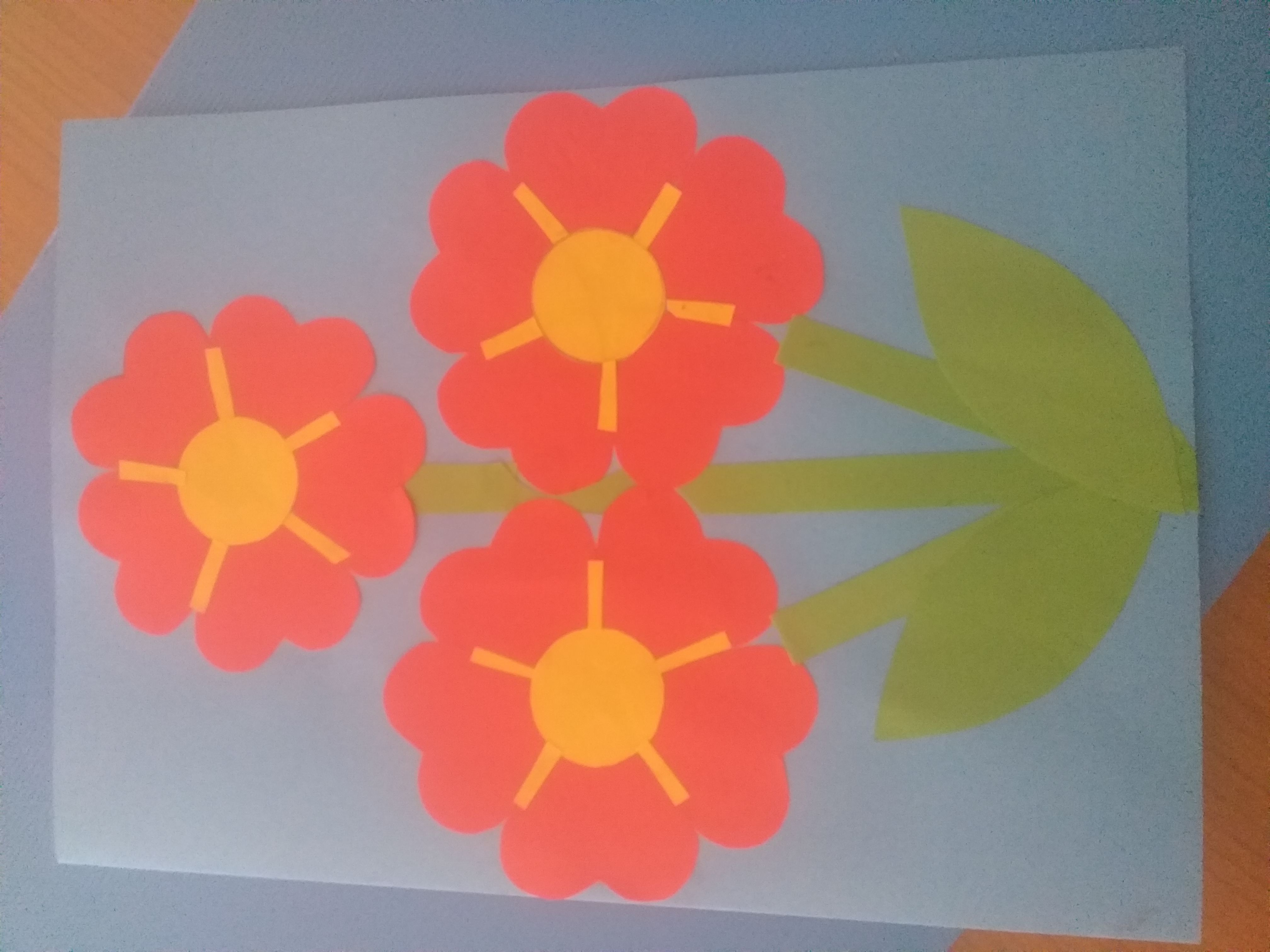 - Najpierw układamy całą kompozycję na laurce bez przyklejania żeby sprawdzić czy wszystko jest dopasowane .