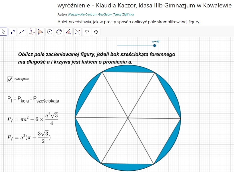 Klaudia Kaczor otrzymała dwa wyróżnienia w IV edycji Ogólnopolskiego Konkursu Matematyka & GeoGebra MaGIK w kategorii Ilustracja twierdzenia lub pojęcia matematycznego oraz w kategorii Ilustracja elementów sztuki lub techniki z GeoGebrą.