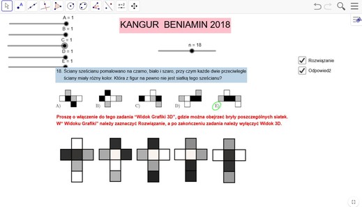 Kinga zwizualizowała obliczanie pól graniastosłupów, a Asia zwizualizowała 30 zadań z Kangura z 2018 roku. Laureatki wykorzystały różne narzędzia i przekształcenia matematyczne, by uzasadnienie i wyjaśnienie problemu było dynamiczne.